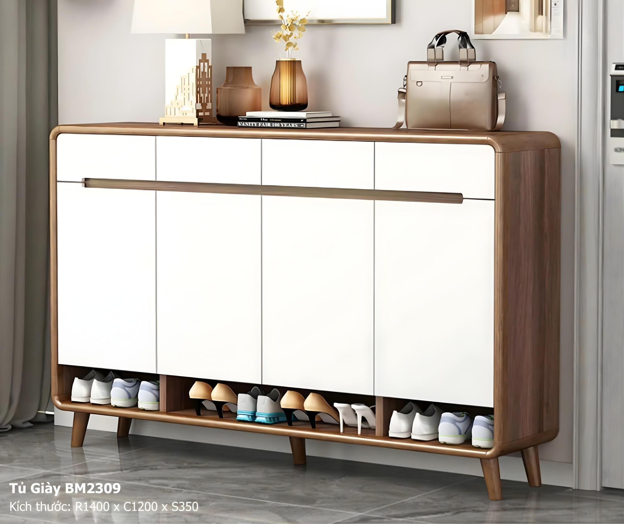 • Tính thẩm mỹ cao: Tủ giày có thể được tích hợp thêm mặt trên rộng rãi để đặt các vật dụng trang trí như lọ hoa, đèn bàn hoặc tranh ảnh, biến khu vực này thành một điểm nhấn nghệ thuật.