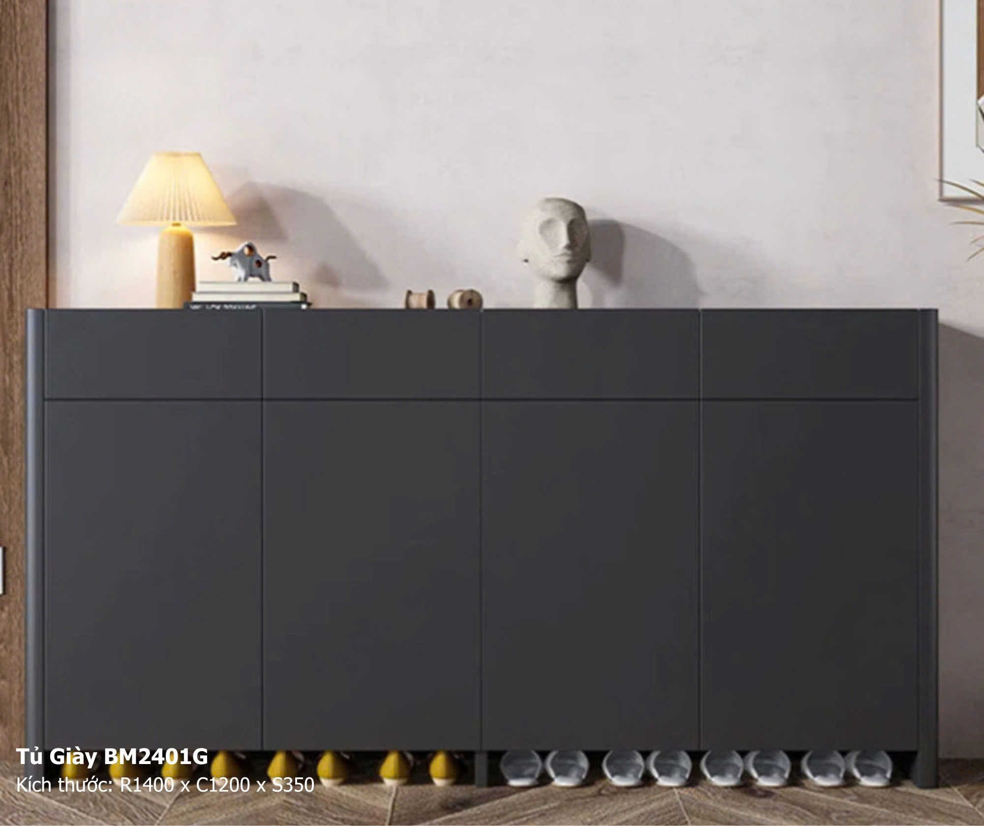 • Tính thẩm mỹ cao: Tủ giày có thể được tích hợp thêm mặt trên rộng rãi để đặt các vật dụng trang trí như lọ hoa, đèn bàn hoặc tranh ảnh, biến khu vực này thành một điểm nhấn nghệ thuật.